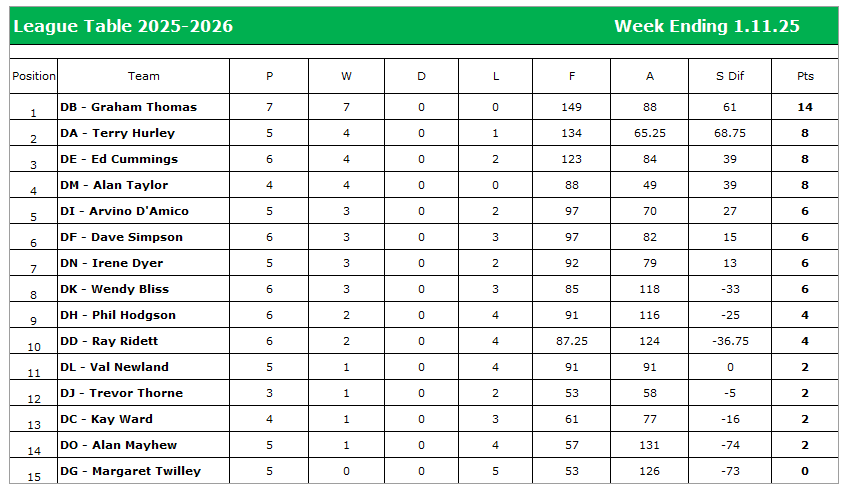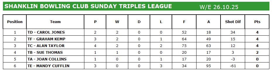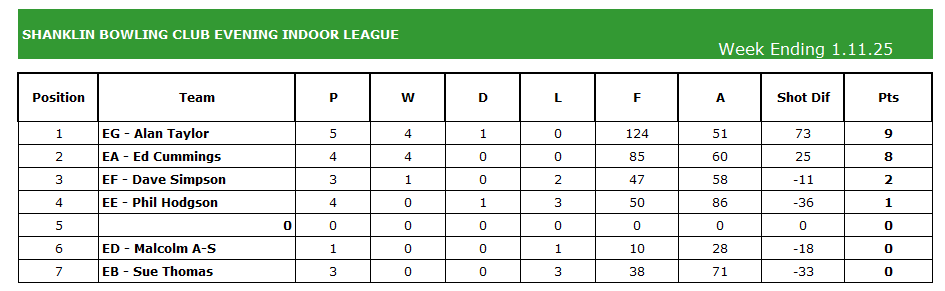 sHANKLIN BOWLING CLUB iNDOOR league Tables 2025-2026
